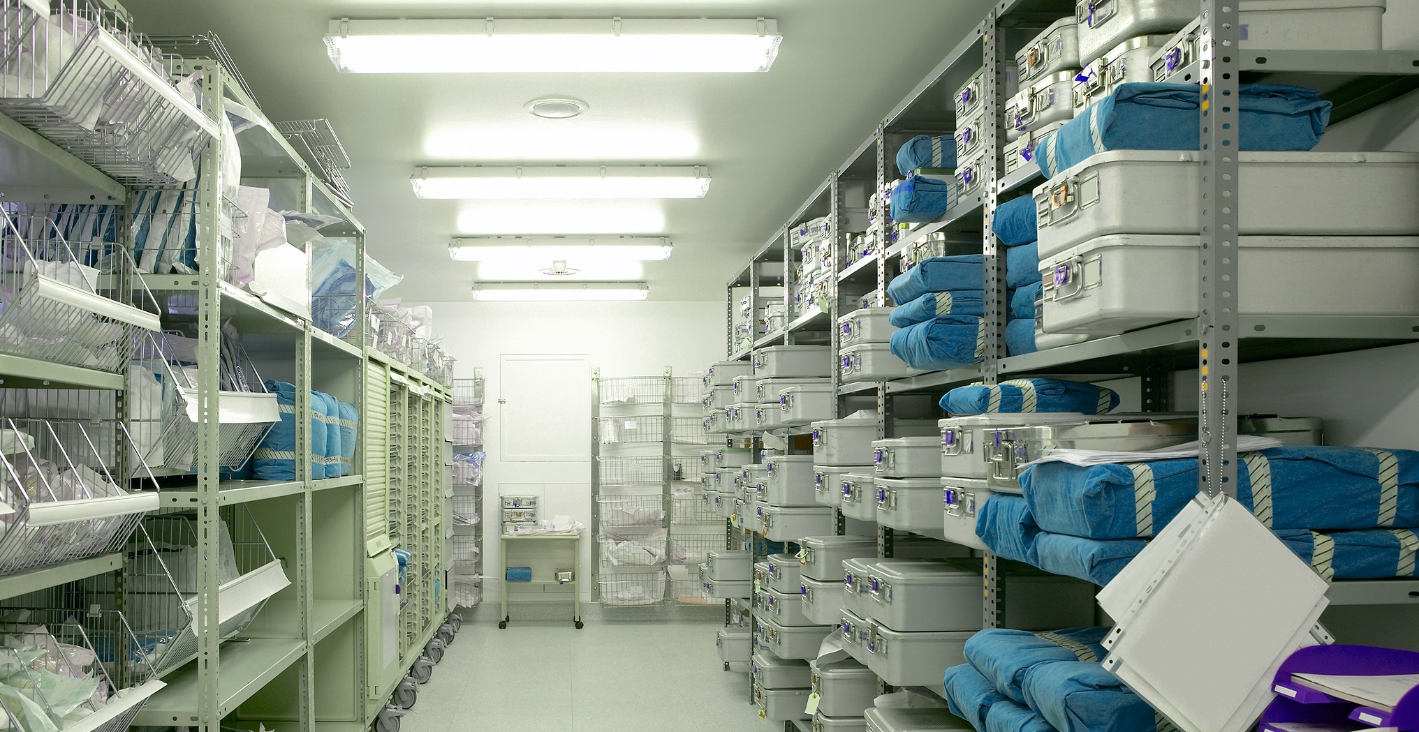 Hospital indoor storage room. Health center repository. Pharmaceutical