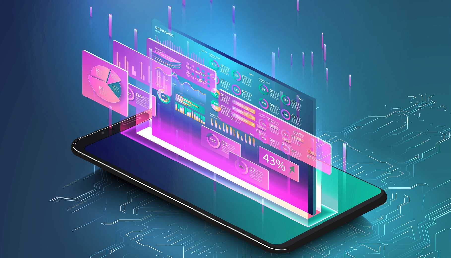 Data statistics. Web Banner. Graph and analytics data on isometric mobile phone.