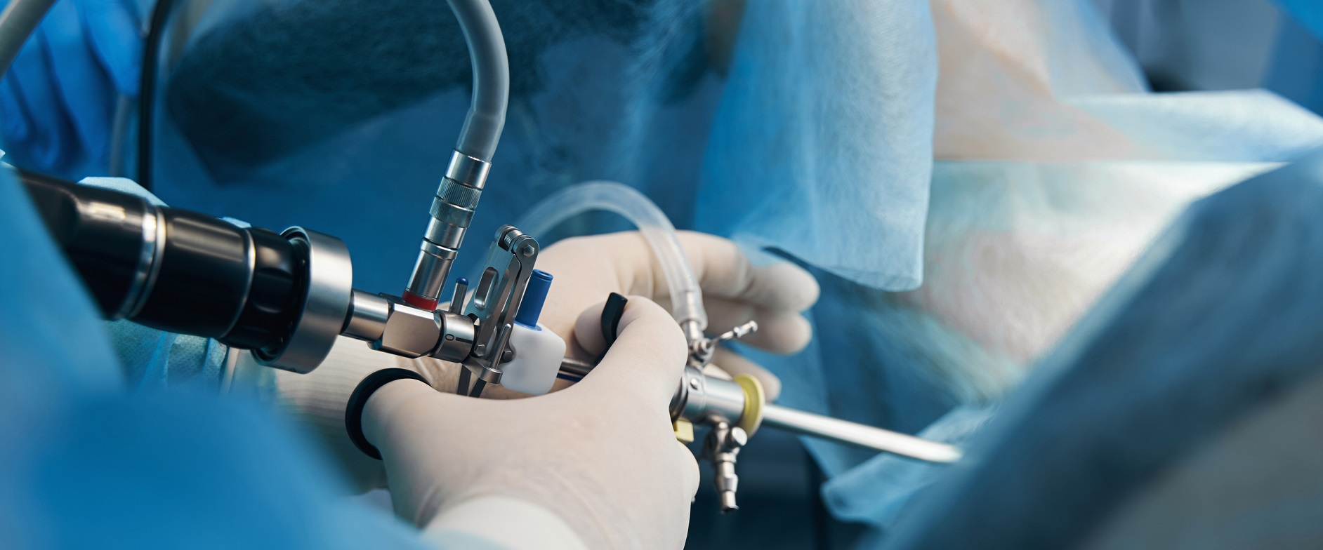 Close up photo of a medical worker in latex gloves standing with a hysteroscope near the patient