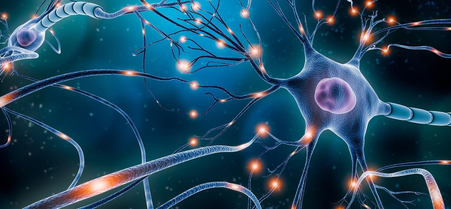Neuronal network with electrical activity of neuron cells 3D rendering illustration. Neuroscience, neurology, nervous system and impulse, brain activity, microbiology concepts. Artist vision.
